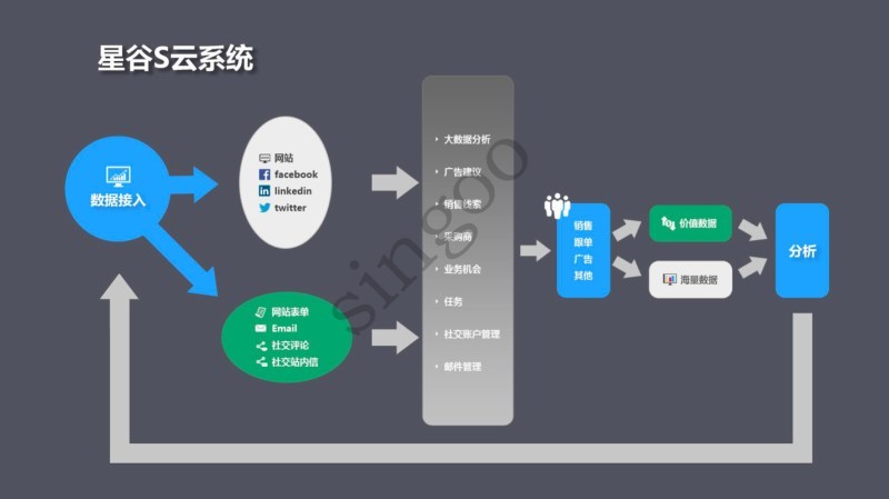 1、S云是一个智能营销数据管理平台,客户将自己:网站+Facebook+LinkedIn+Twitter等外贸社交媒体平台数据接入S云平台进行统一管理。