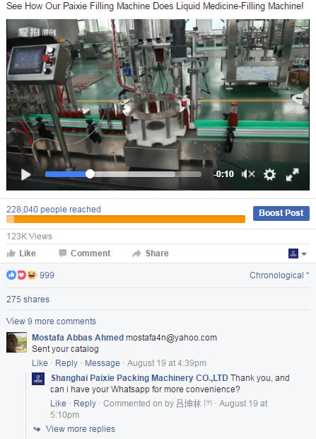 星谷Facebook运营人员选取派协主打产品互动律最高的帖子,投放广告。灌装机械行业因其产品的特殊性,仅仅依靠图片与文字,无法将产品的特点很好的呈现在海外采购者眼前。派协拥有精良优质的灌装包装设备,为了让买家看到派协真实的精良产品及设备,在其Facebook运营之初,运营人员就将每日更新发帖的重点放在了派协的产品视频上,而不是密密麻麻的文字介绍和图片展示上,让老外一打开就能迅速看到高质量的灌装设备和产品的生产过程,这对于在海外知名度并不高的公司而言,效果非常明显,很快就获得很多亚非拉市场买家的咨询和采购。