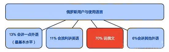 俄罗斯,俄语使用人数占比高达70%,能流利讲英语的人群比例只占11%。原来这就是为什么Yandex能够凭借语言优势,已经占领搜索领先地位长达10年的原因。
