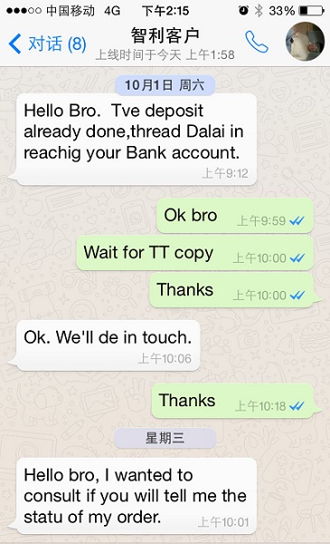 智利人还真的很守时,早上8点58分,她准时打来了电话。一口气跟我列出了8个问题,我一边听,一边重复确认,并做着笔记。她的问题完毕,我就开始一个接着一个的来回答他的问题。她听懂了,就直接翻译给老头听。整整通话1个半小时,彼此都聊得很开心,直到现在,我感觉是“一锤定音”的时候了。我问对方,问题都清楚了吗?她回答“yes”,我紧接着,告诉对方,你们有没有Skype?他们说:“我们都是很笨的老人了,不会弄这个,等孩子回来之后,让他们安装”。接着问我:“为什么要Skype呢?” 我说:“为了尽快让老头放心,我打算用Skype跟您和老头做一个Skype video call”,一来让你们了解一下我们的工厂和产品,二来可以让你们放心的跟我做生意,打消他的疑虑。对方回答:“my god ,小甜心,你真是太贴心了”。我们再次约定好,第二天上午skype 视频直播。