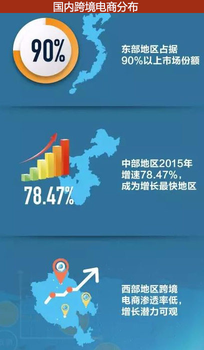 以广东、浙江及福建为代表的东部地区占据了90%以上的市场份额。中部地区2015年增速78.47%,西部地区跨境电商渗透率较低,增长潜力可观。